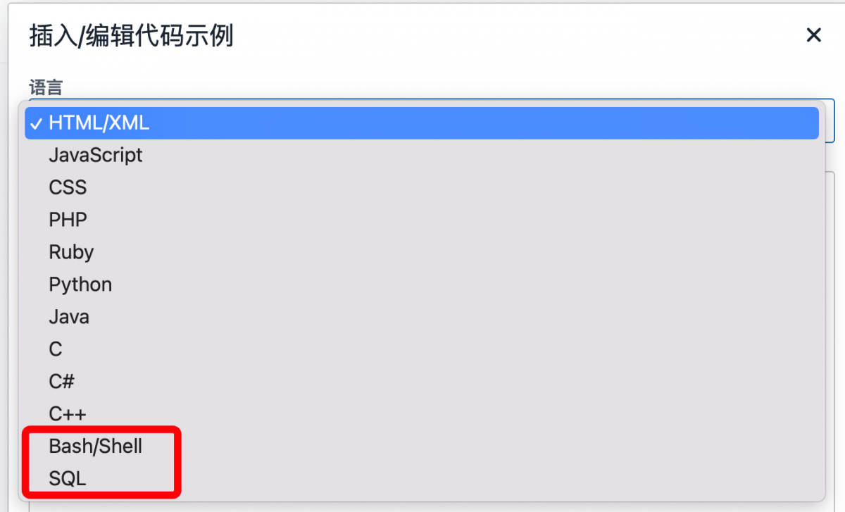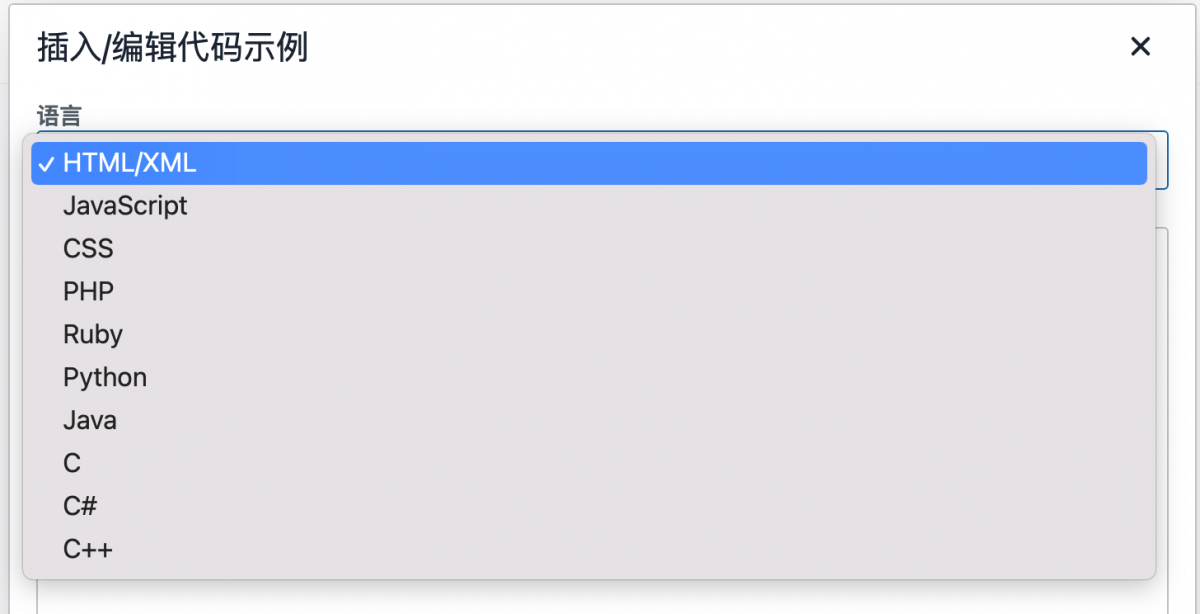 在tinymce的初始化配置中,有codesample_languages这个选项,支持的语言在这里配置,我们只需要更改这里的配置即可。