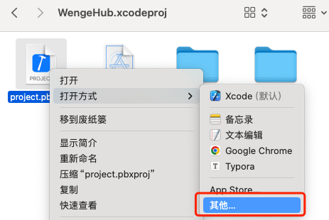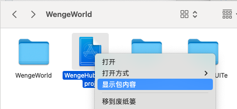 右键点击WengeHub.xcodeproj,选择显示包内容,第二步要修改的文件在WengeHub.xcode文件夹中