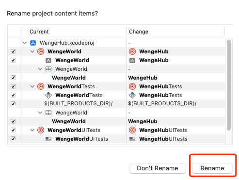 在文件夹中WengeHub.xcodeproj打开项目,然后把想要更改名称的文件和类按需改名即可。