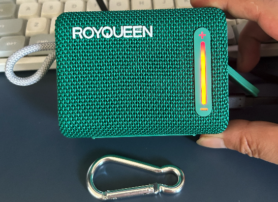 感觉还是比较大,宽高还能接受,但是比较厚,比想象中的厚。外面这个绿色的是针织的,手感还行。看过小米的那一款蓝牙音箱,感觉手感极差。
