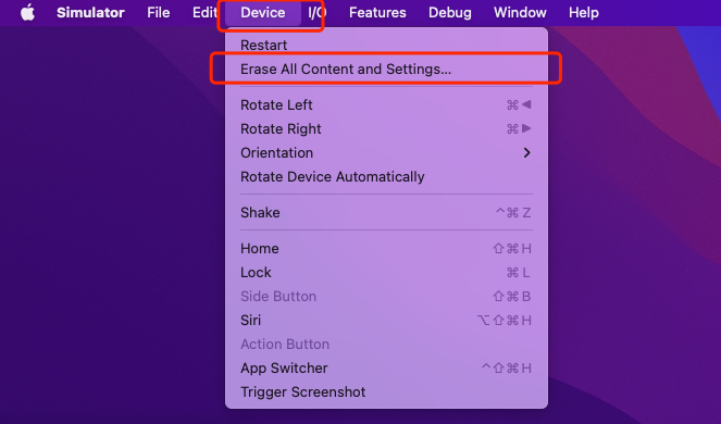 在模拟器的菜单栏的Device菜单下面,选择Erase All Content and Settings,就可以重置模拟器