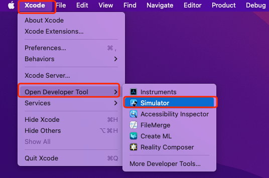如果模拟器没有打开的话,可在Xcode的菜单栏,选择Open Developer Tool下面的Simulator打开模拟器