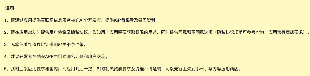 上次提交是周五下午,等到晚上,依然没有审核,都说酷安凉了,所以对这个平台周末能否审核就持怀疑态度。到了周一,还是没结果,再到周二,还是没结果,心里基本上已经不抱什么期望了,这个办事效率,平台不凉才怪。到了今天上午(周三)又打开一看,显示审核未通过,没有未通过的原因,连站内信都没有,呵呵,体验极不友好。瞎猜一下,可能是没有软著的原因,你到时好歹也给个准确提示呀,话说回来,有软著的话,还用上架到你这平台吗,直接上架到各大应用市场它不香吗。因为某些原因,你被打压,打压的快凉了,不是你的错,可好歹你也给个提示呀,直接告诉个人开发者请绕道就行了。现在挺气愤的。