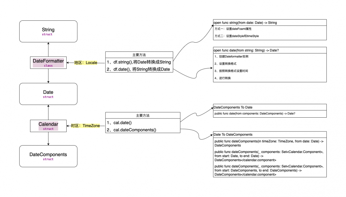 打开文档学了之后才发现,Swift的时间和日期还是挺复杂的,想用的东西都得自己封装实现,这就要求对Swfit时间和日期处理这块的基础知识相当扎实才行,最开始看了很多文档都一头雾水,知道看到了某个大神写的一篇Swfit日期处理的文章,才茅塞顿开,因为它上面的一张配图,让我对Swift时间日期的处理有了整体的思路,有了思路之后,剩下的就是去理解和实践。