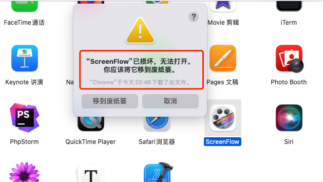 现在又遇到了文件已损坏的情况,打开时提示"XX已损坏,无法打开,你应该将它移到废纸篓",入下图: