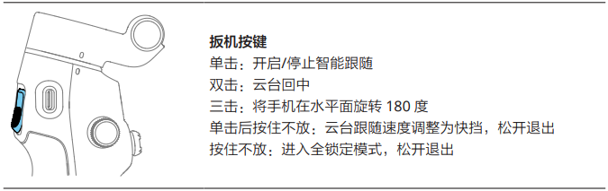 全锁定模式:按住扳机键不放,会进入全锁定模式,此时任何方向都不会移动(提示:超过一定摆动幅度后手机会跟随)
