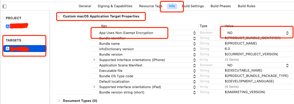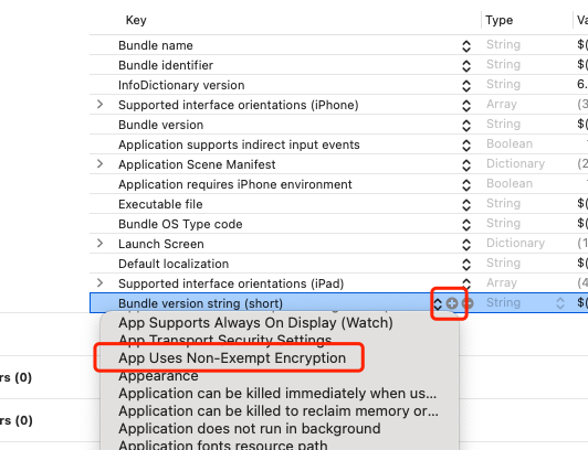 ios app审核提示“缺少出口合规证明” 所属分类:ios | 浏览:1342 | 发布于 2023-11-30 在target的Info标签页的Custom macOS Application Target Properfies里面添加一个键值对即可。 键名为:App Uses Non-Exempt Encryption 建值为:No 如下图所示: 本文链接: https://haitaoblog.com/a/Y3UraFdGSTBSWGZ0K1IxdWRvOGVMQT09.html 版权声明: 本博客所有文章除特别声明外,均采用 BY-NC-SA 许可协议。转载请注明出处!