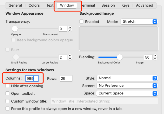 但是这样页有一个问题,把列宽设置成999,这个打开这个Session的时候,iTerm 2会很宽,需要手动调整窗口。