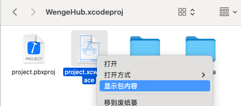 右键点击WengeHub.xcodeproj,选择显示包内容,第二步要修改的文件在WengeHub.xcode文件夹中