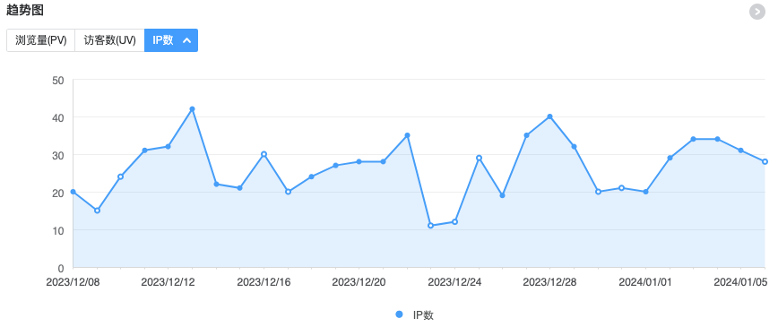 没什么可写的,更新一下最近的博客访问数据 所属分类:网站建设 | 浏览:1685 | 发布于 2024-01-06 没什么可写的,更新一下最近的博客访问数据,这里只用ip作为比对标准。 直接上统计图 可以看到最近维持在日ip 30左右,中间有几天日ip只有十几,我还以为个人博客彻底凉了呢,后来又恢复到30左右,算是恢复正常预期吧。 就这样吧,水一篇。 本文链接: https://www.haitaoblog.com/a/QW5CUklwNXhRK29UK21tbWlCdUZqZz09.html 版权声明: 本博客所有文章除特别声明外,均采用 BY-NC-SA 许可协议。转载请注明出处!