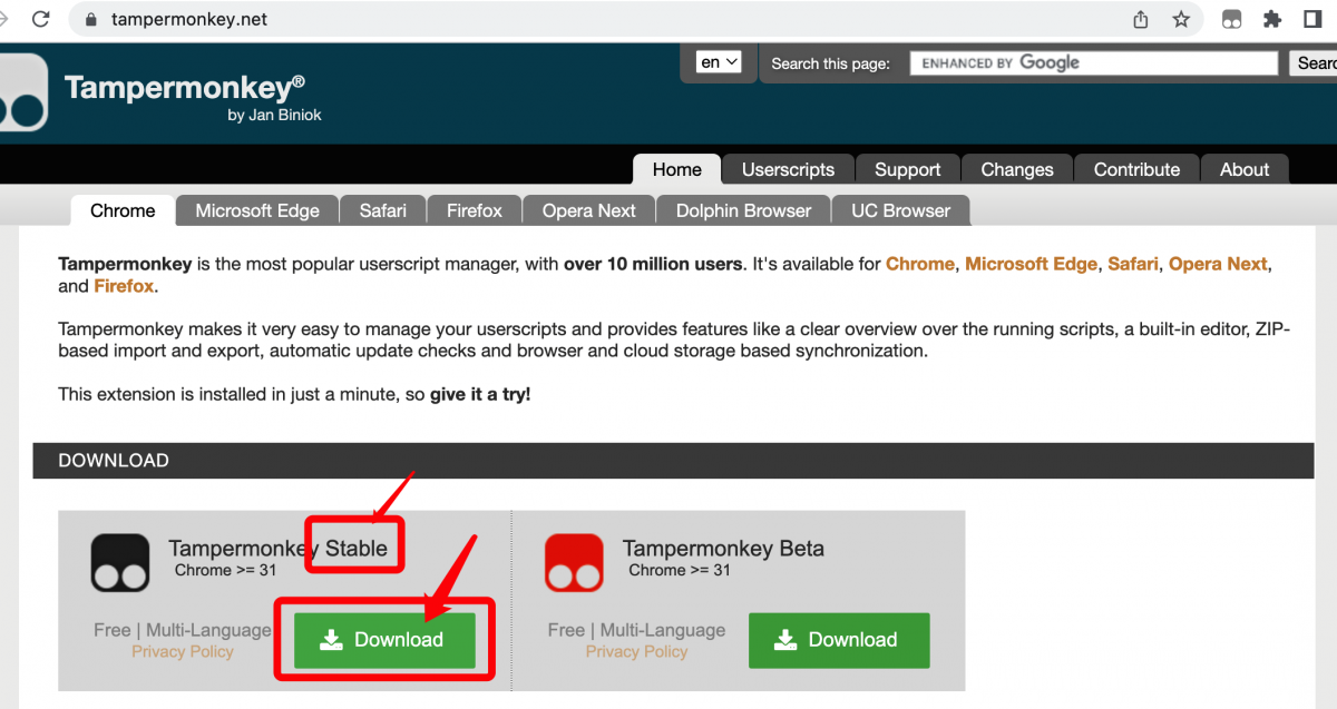 2. 一般选择Stable稳定版,点击Download,即可跳转到浏览器对应的应用商店的详情页面。