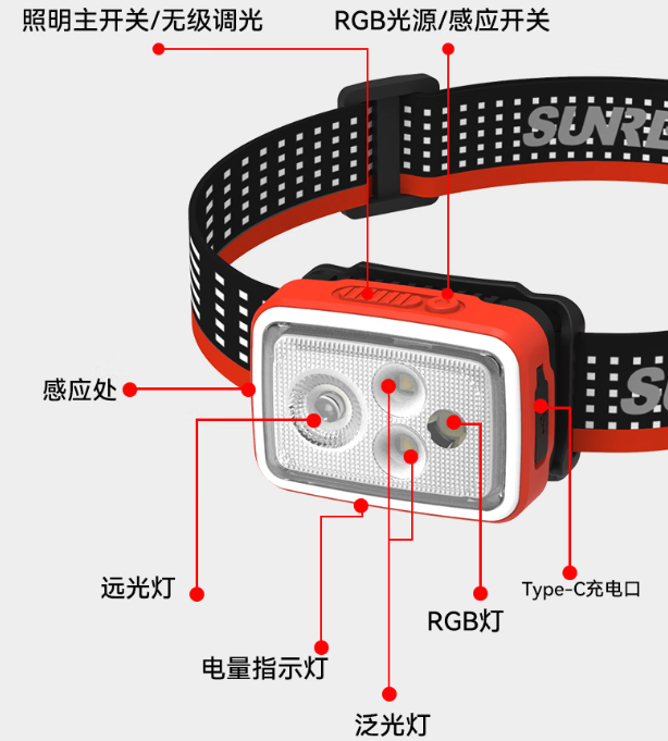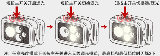待机状态下,短按照明主开关,按远光->泛光->远+泛光->OFF模式进行切换