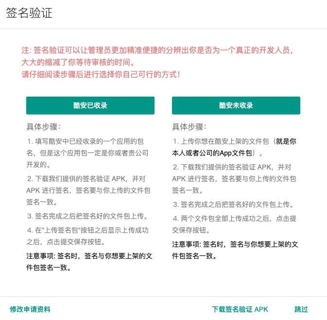 注册完了就要进行签名验证,签名验证有两种方式,见下图