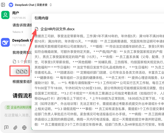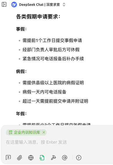 3.3.7、搜索请假流程,会发现大模型会调用刚刚创建的知识库