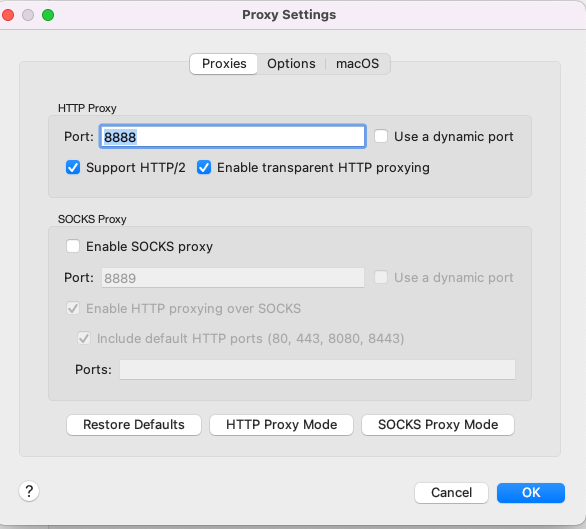 在菜单栏Proxy->Proxy Settings,这里可以查看代理端口